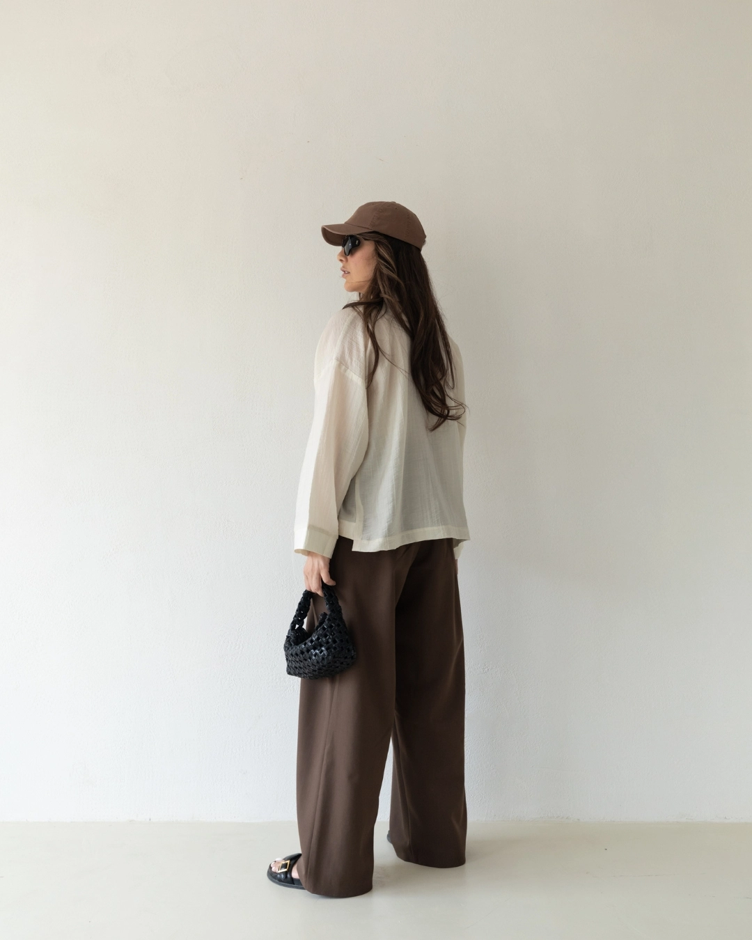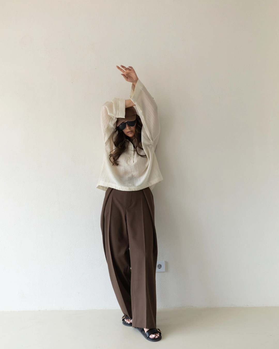 شومیز زنانه لینن با طراحی جلو بسته و دو دکمه زیر یقه، سبک و خنک. مناسب استایل روزمره و نیمه رسمی در فصلهای بهار و تابستان، با ظاهری مینیمال و شیک.
