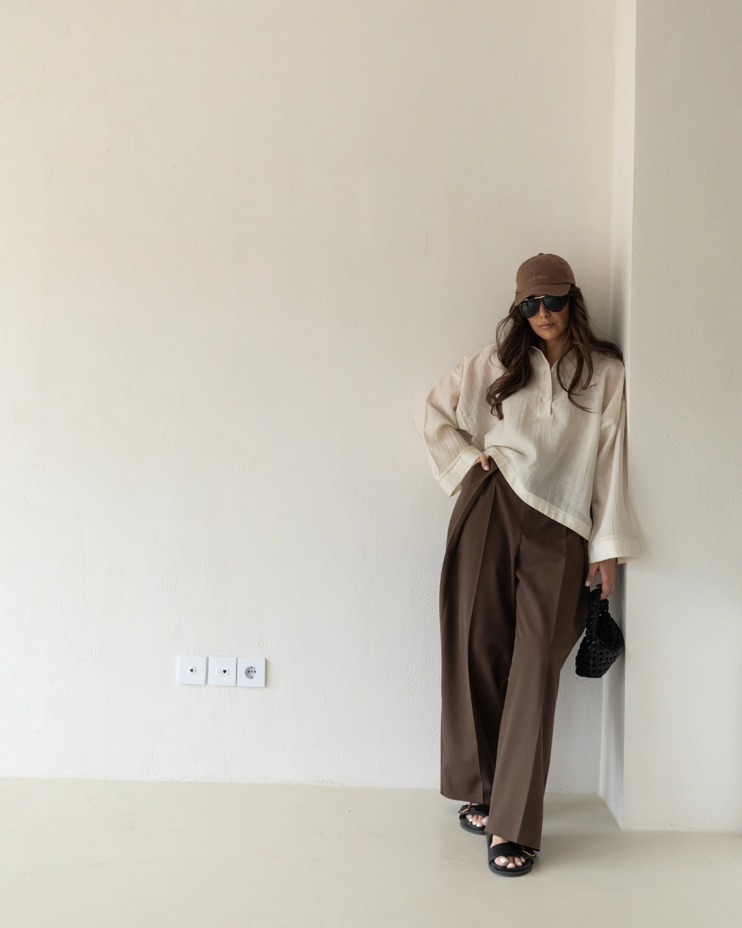 توضیحات : شومیز زنانه لینن با طراحی جلو بسته و دو دکمه زیر یقه، سبک و خنک. مناسب استایل روزمره و نیمه رسمی در فصلهای بهار و تابستان، با ظاهری مینیمال و شیک.