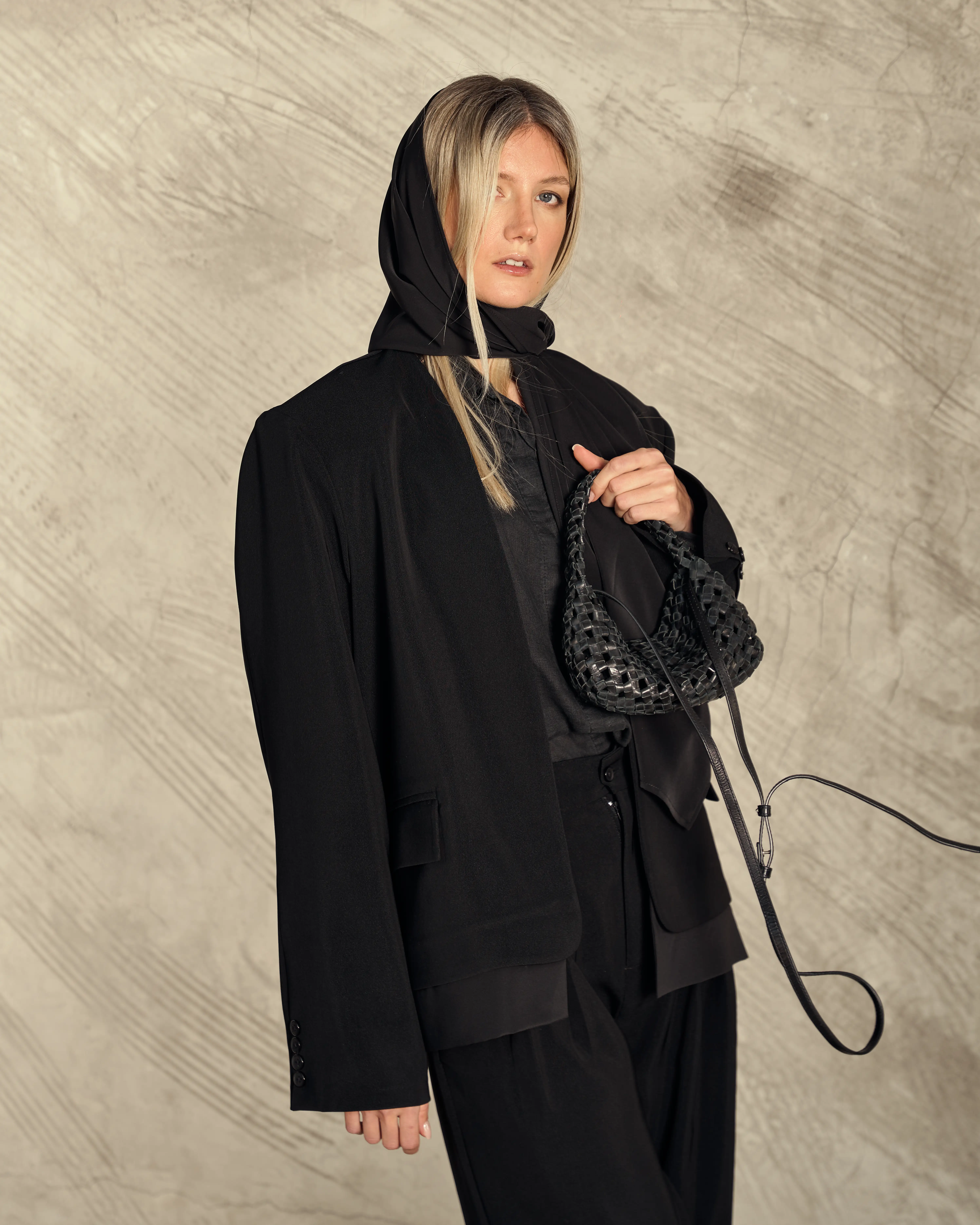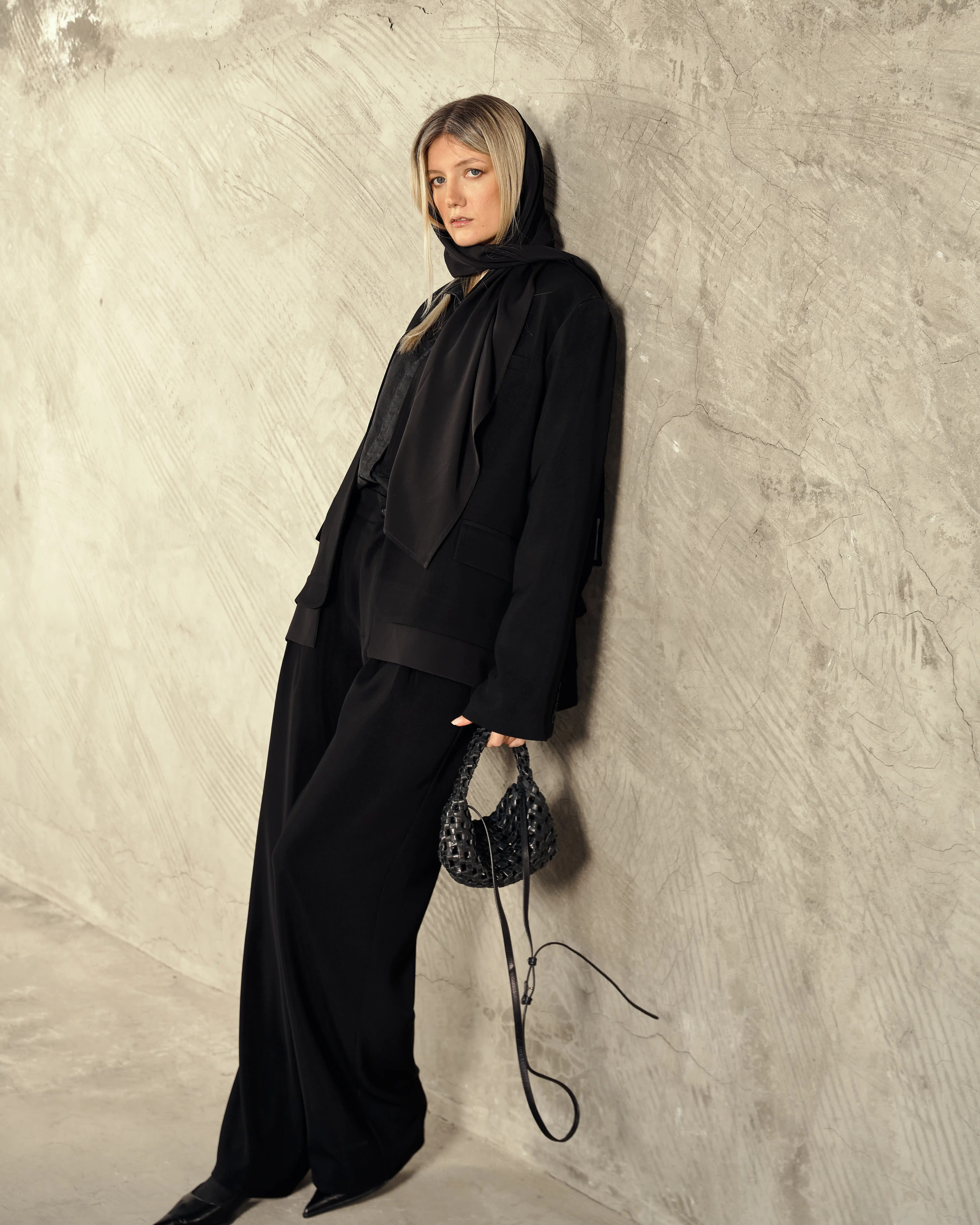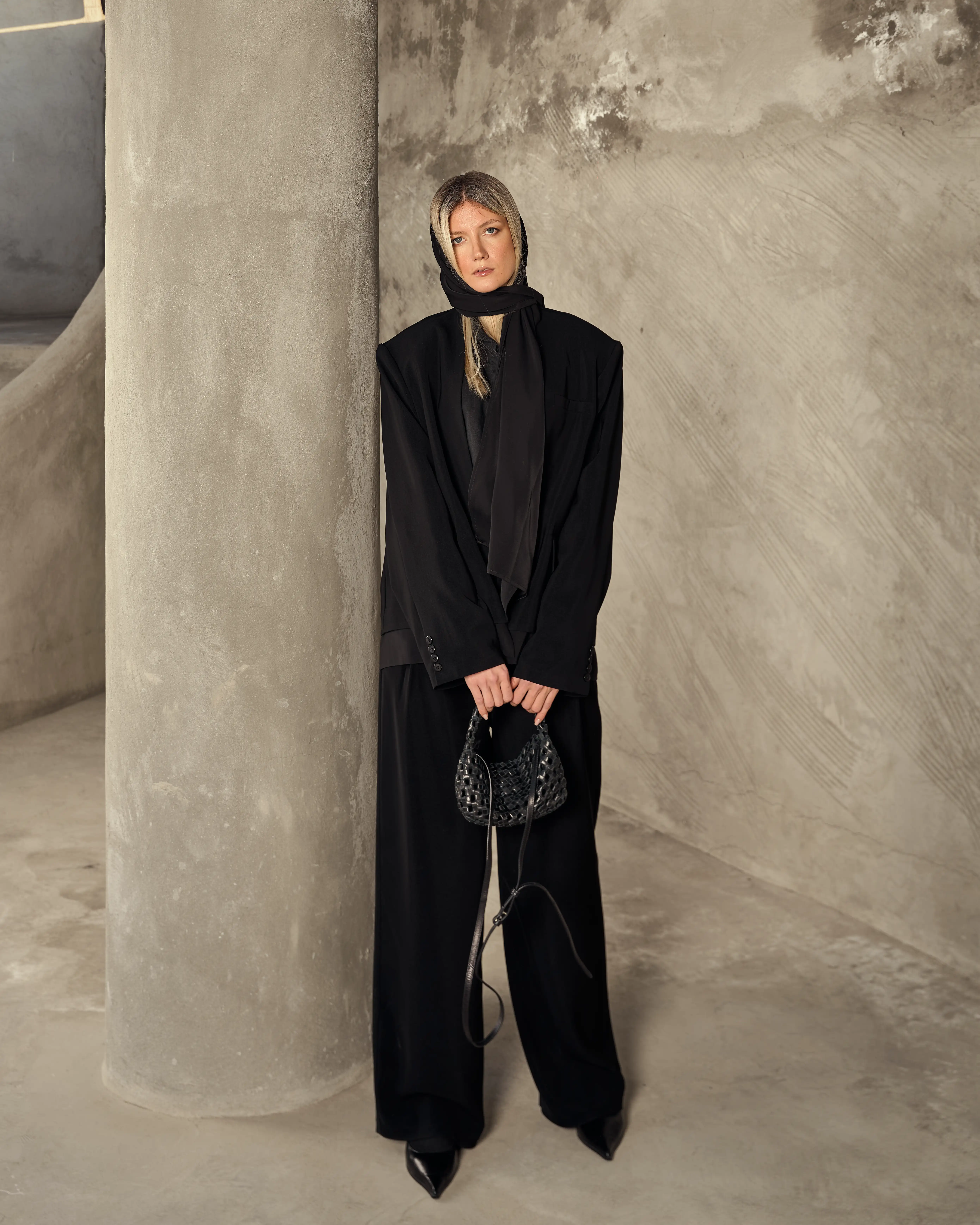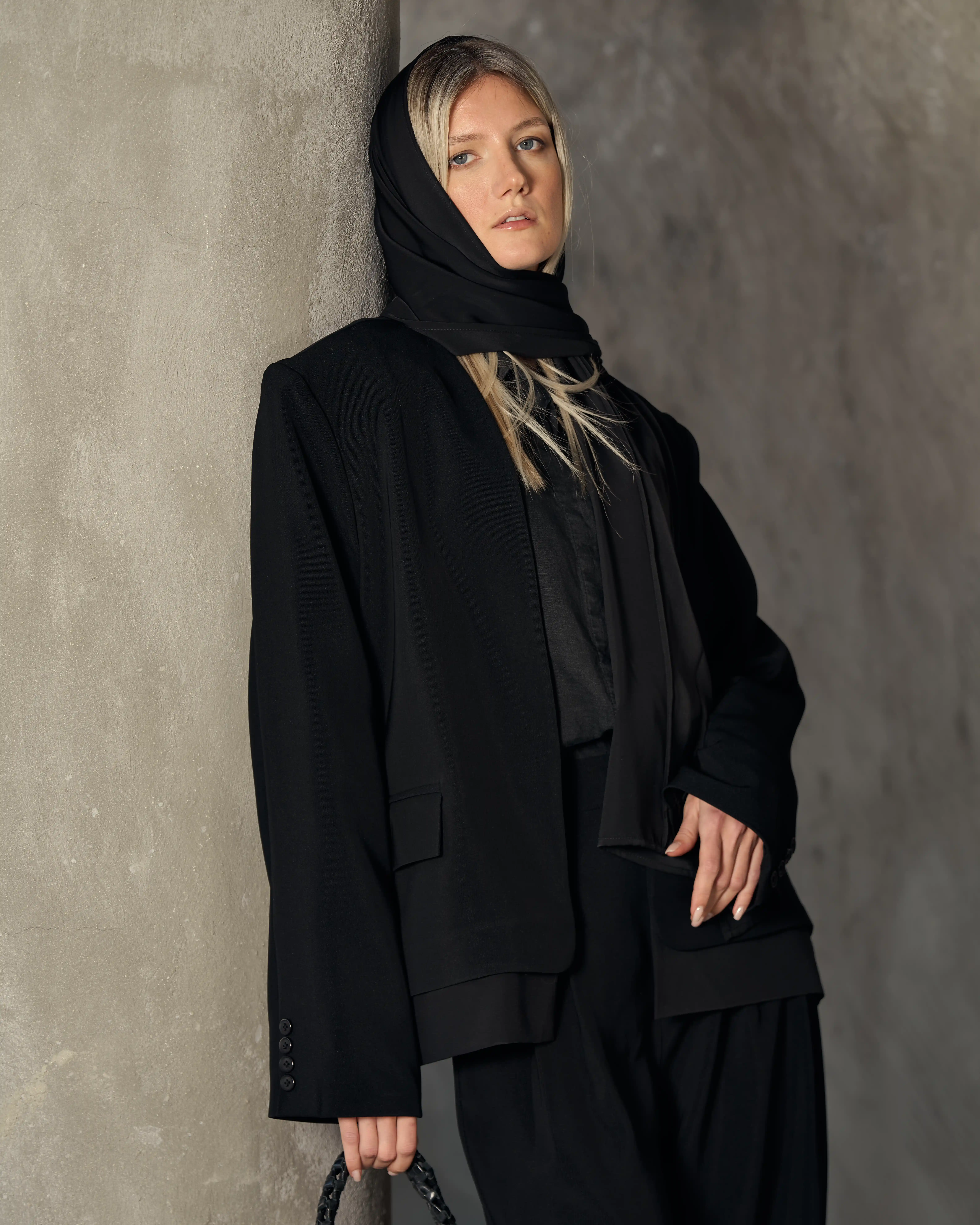 توضیحات : کت کرپ زنانه با یقه ۷ و جزئیات حریر، سبک و شیک، مناسب استایل رسمی و نیمهرسمی در فصلهای بهار و تابستان.